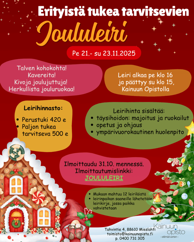 Lämmintä joulun taikaa ja yhteistä iloa on luvassa erityistä tukea tarvitsevien joululeirillä Kainuun Opistolla. Tule mukaan juuri sellaisena kuin olet, luvassa mukavaa yhdessä oloa, kivaa tekemistä ja tietysti jouluherkkuja turvallisessa ja iloisessa ilmapiirissä. Menossa mukana joulumuori Lissu ja muut tutut ohjaajat.