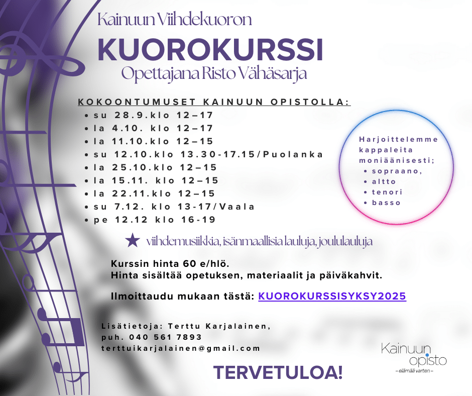 Kurssihinta (60 e) sisältää opetuksen, materiaalin ja päiväkahvit. Ilmoittaudu mukaan tästä linkistä: KUOROKURSSISYKSY2025