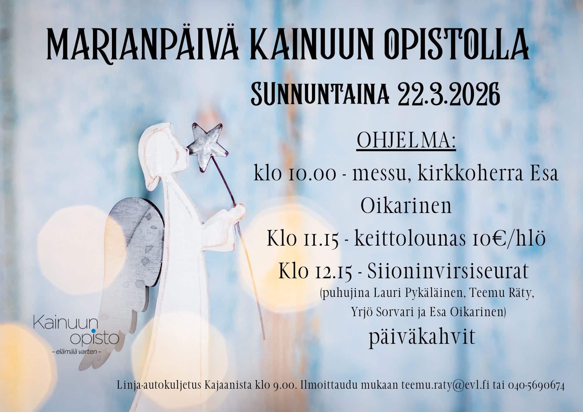 Tule viettämään Marianpäivää Kainuun Opistolle 22.3.2026. Ohjelma: 10.00 Messu (kirkkoherra Esa Oikarinen) 11.15 Keittolounas 10€/hlö 12.15 Siioninvirsiseurat (puhujina Teemu Räty, Lauri Pykäläinen, Yrjö Sorvari ja