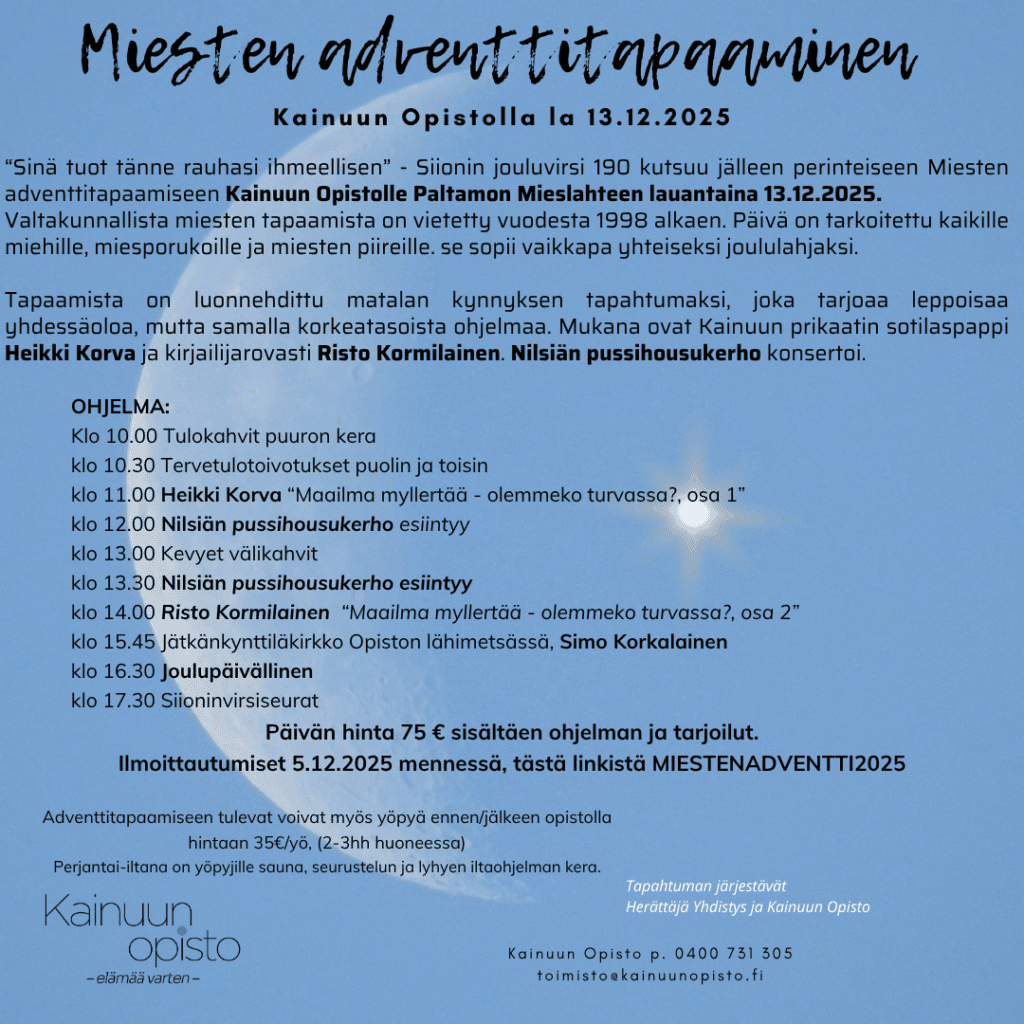 Pysähdy hetkeksi ennen joulua – tule mukaan Miesten adventtitapahtumaan Opistolle. Tänä vuonna kainuulaisten puheenvuorojen lisäksi saamme ihmeteltäväksemme Nilsiän pussihousukerhon Pohjois-Savosta. Lisäksi tietysti herkullista jouluruokaa tarjoaa oman keittiön väki.